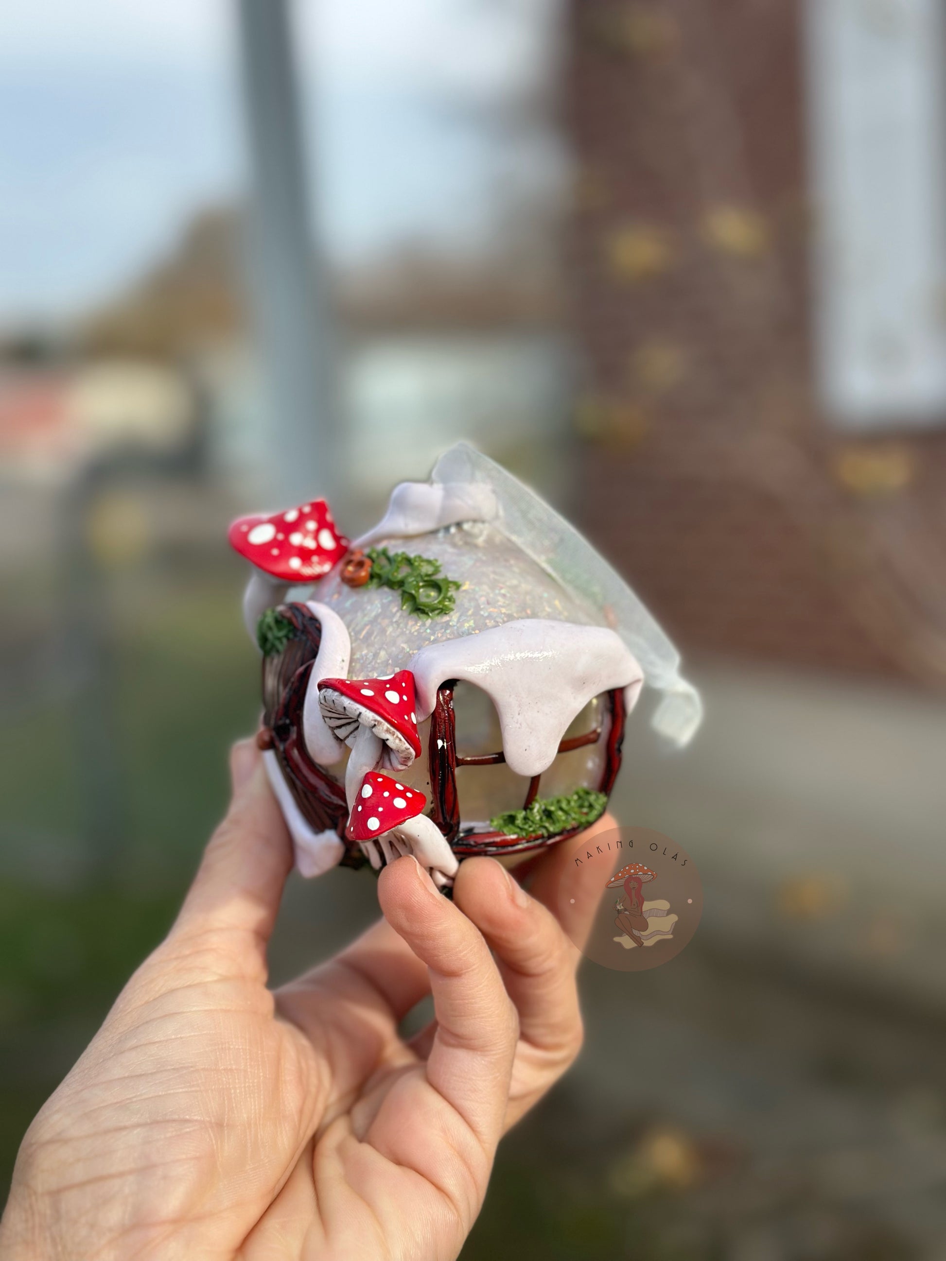 Fairy house ornaments will make your Christmas extra special. Clay is handsculpted over the glass ornament. These are made to last for years and years. Meant to become a family heirloom.