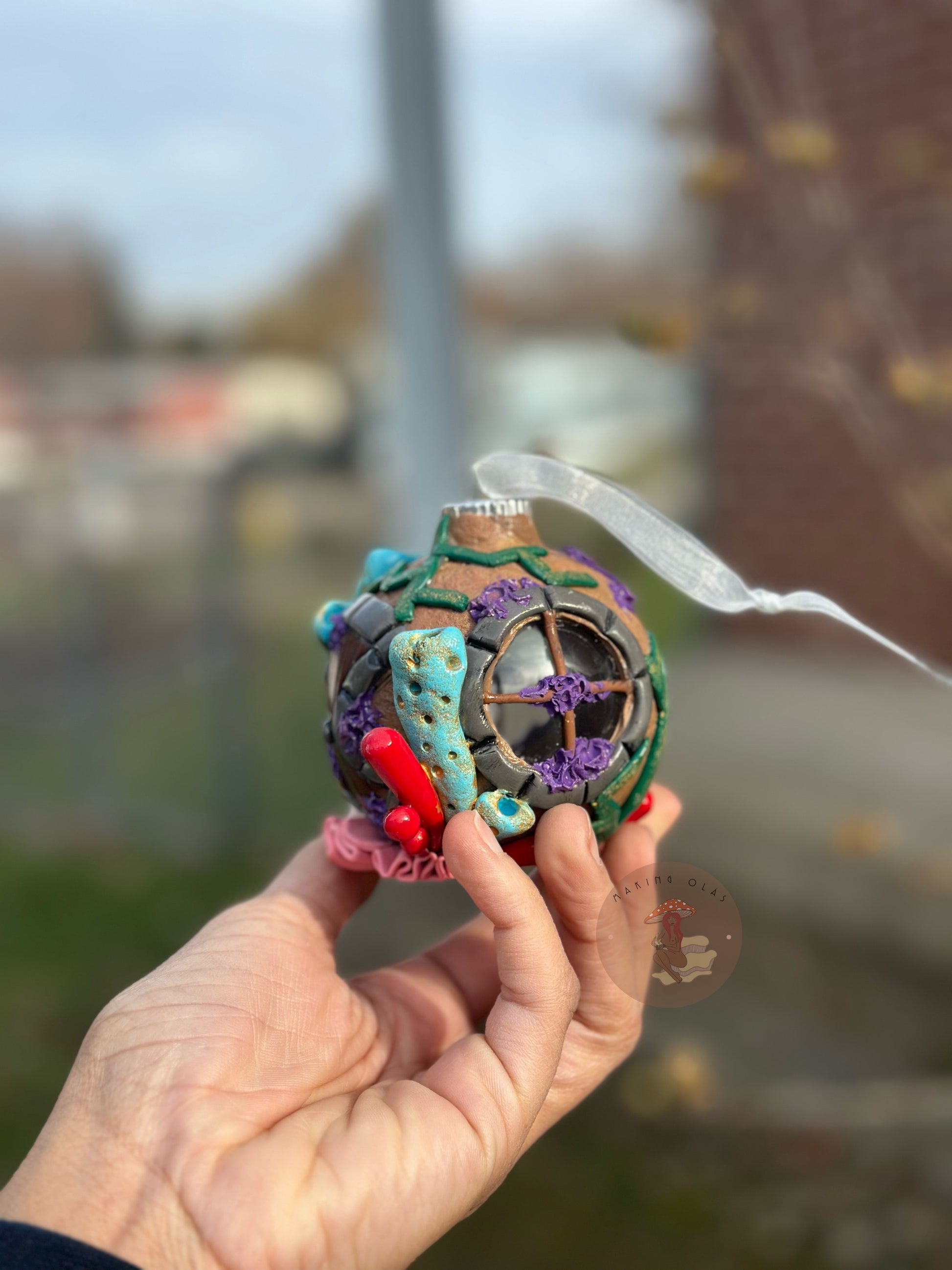 Fairy house ornaments will make your Christmas extra special. Clay is handsculpted over the glass ornament. These are made to last for years and years. Meant to become a family heirloom.