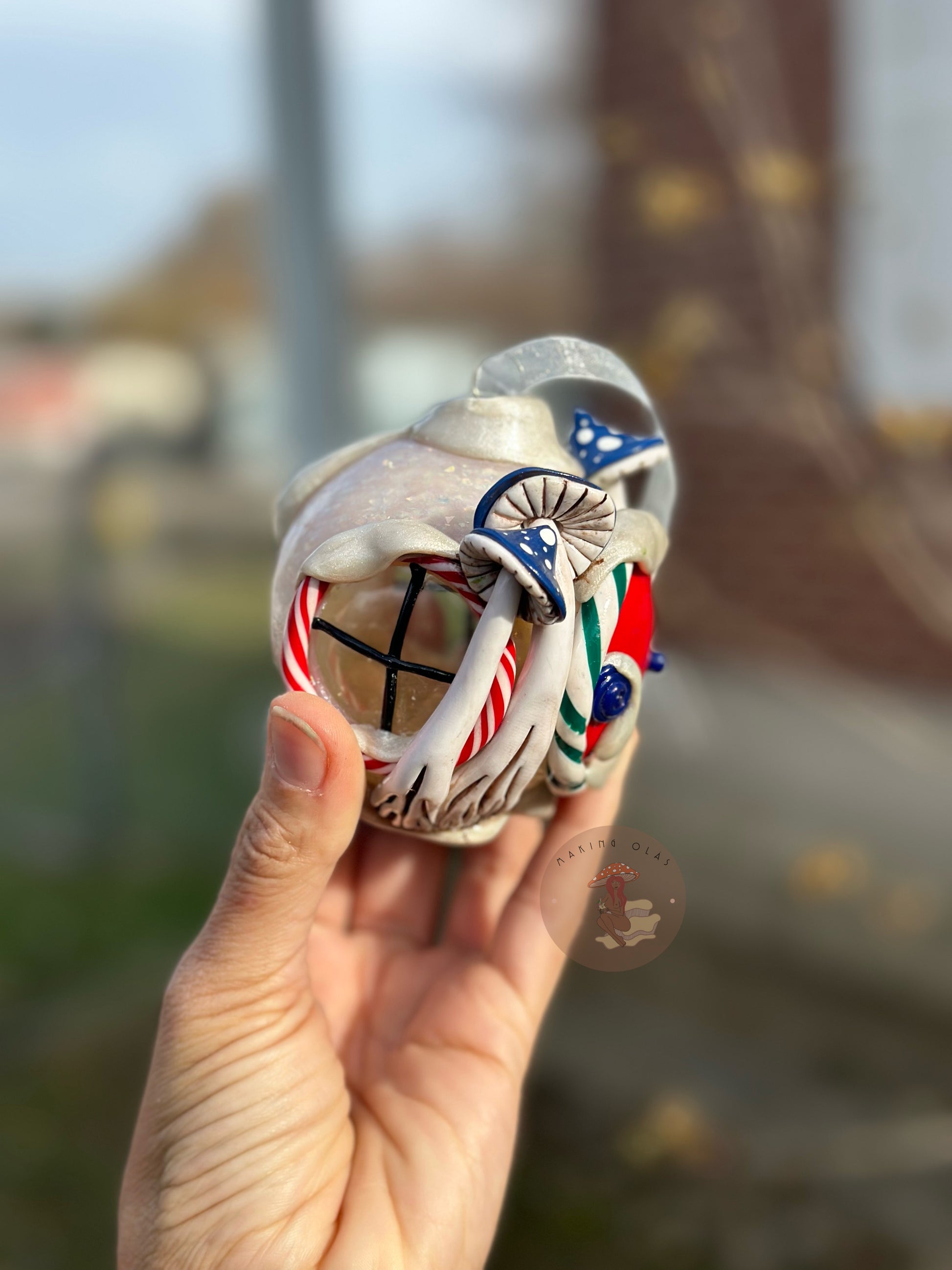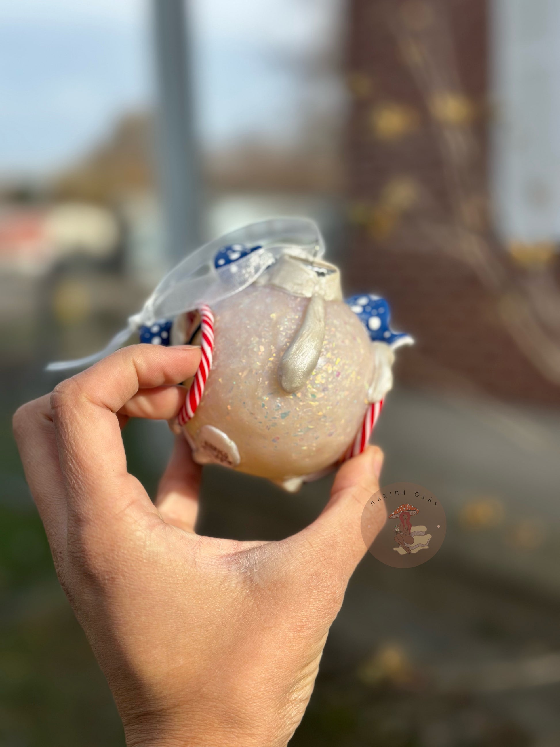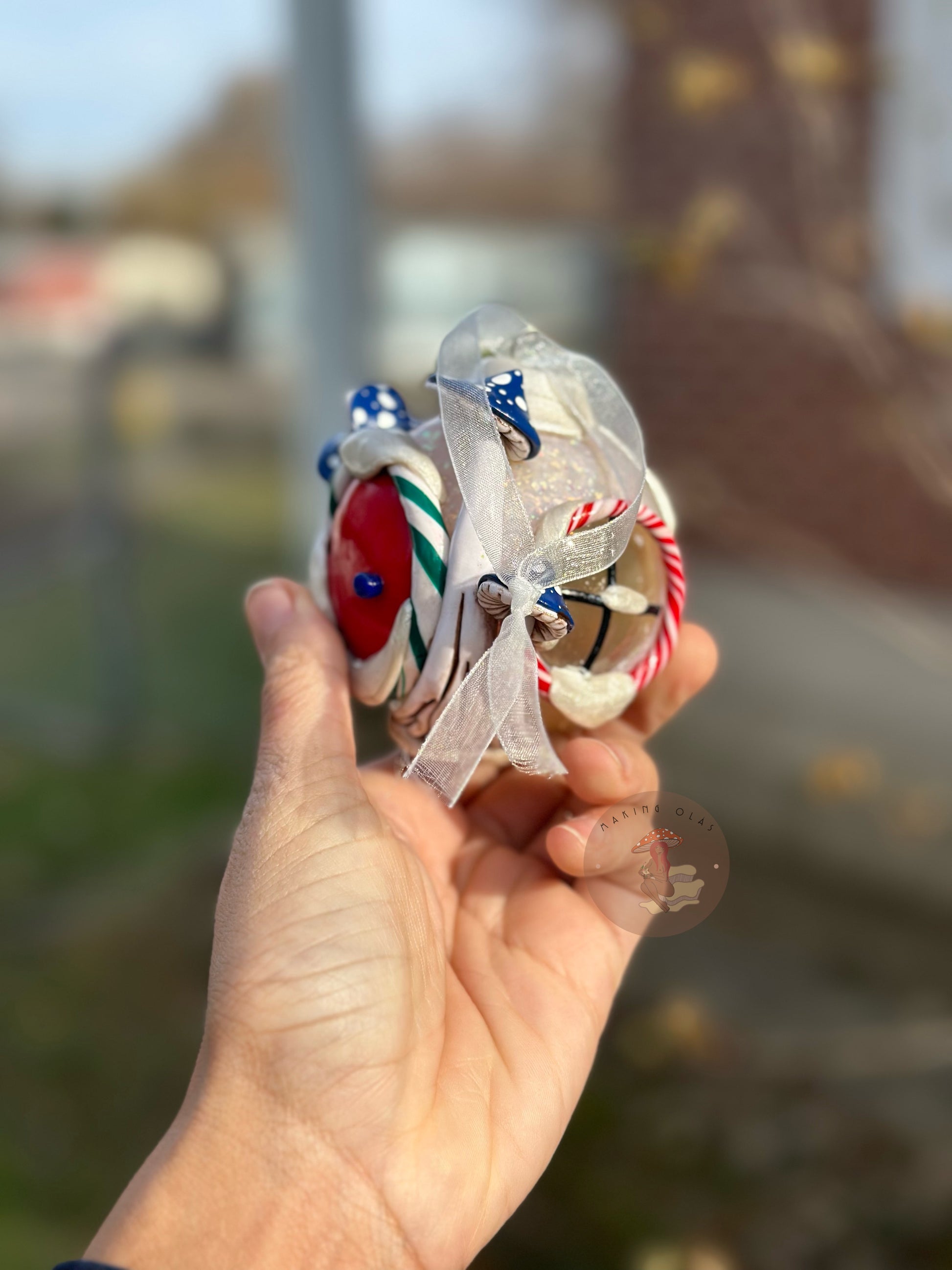Fairy house ornaments will make your Christmas extra special. Clay is handsculpted over the glass ornament. These are made to last for years and years. Meant to become a family heirloom.