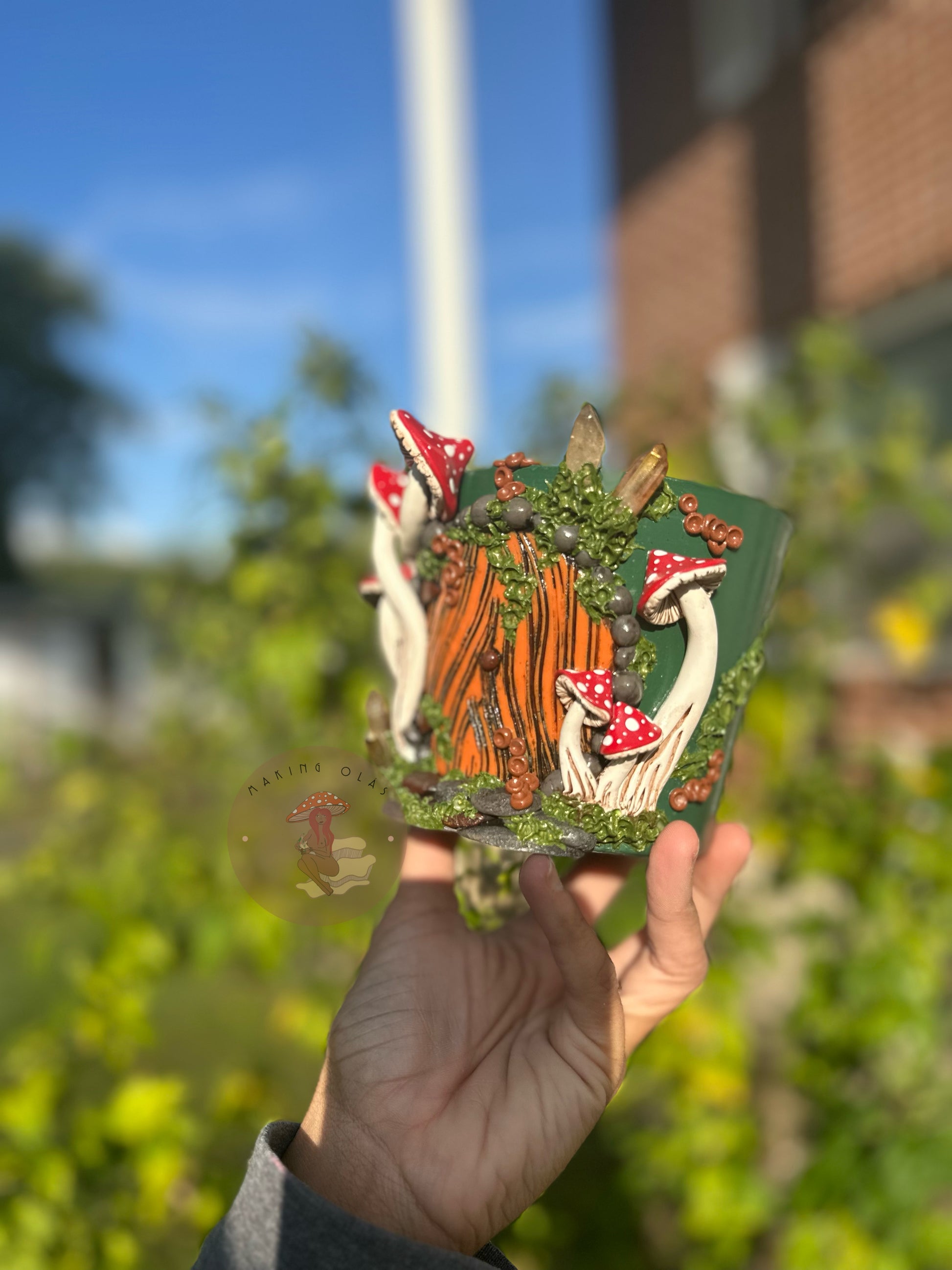 Plant Pot | 4” tall Fairy House with Red Mushies + Quartz