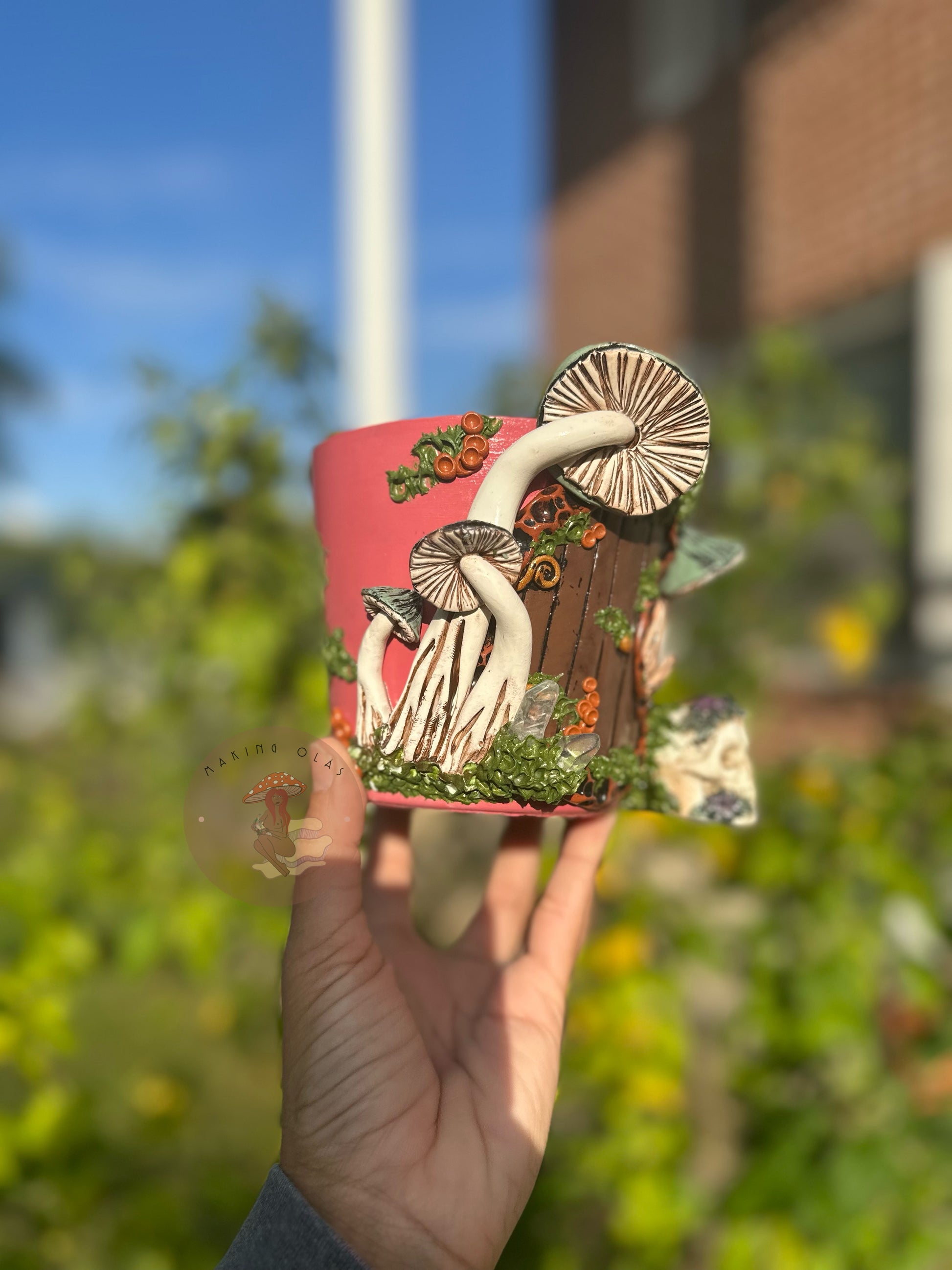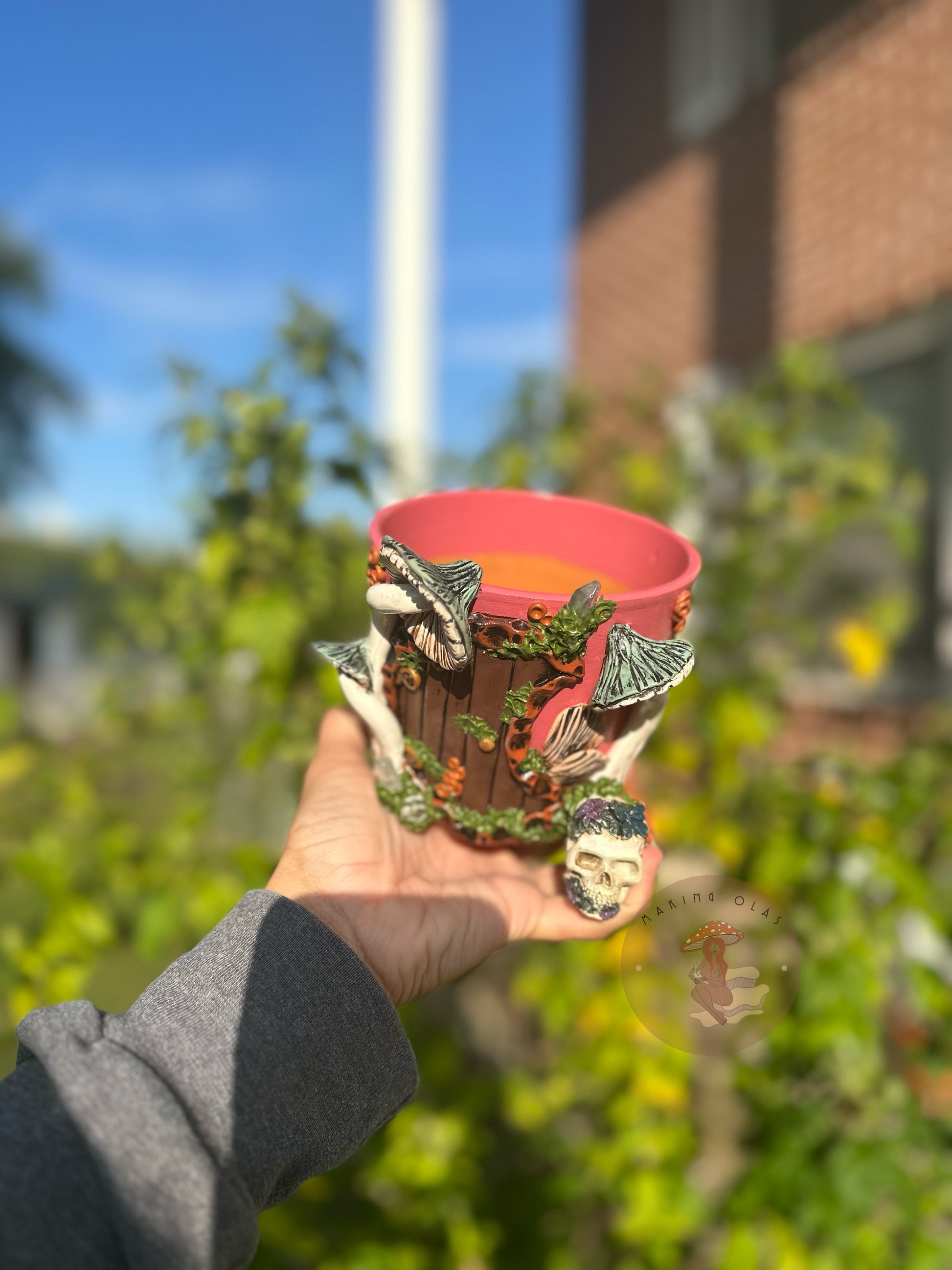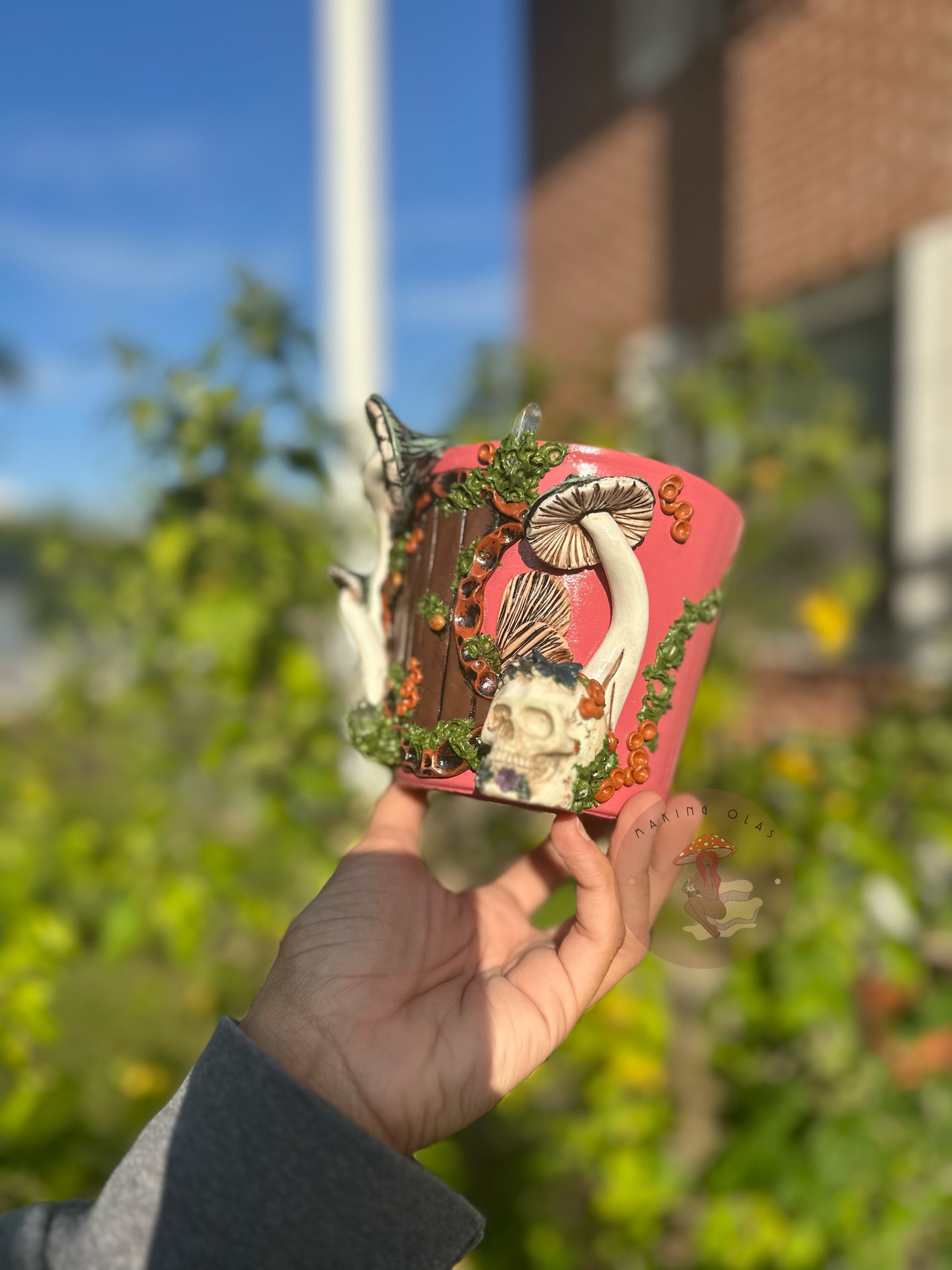 Plant Pot | 4” tall Fairy House with light Jade Mushies Quartz + skull