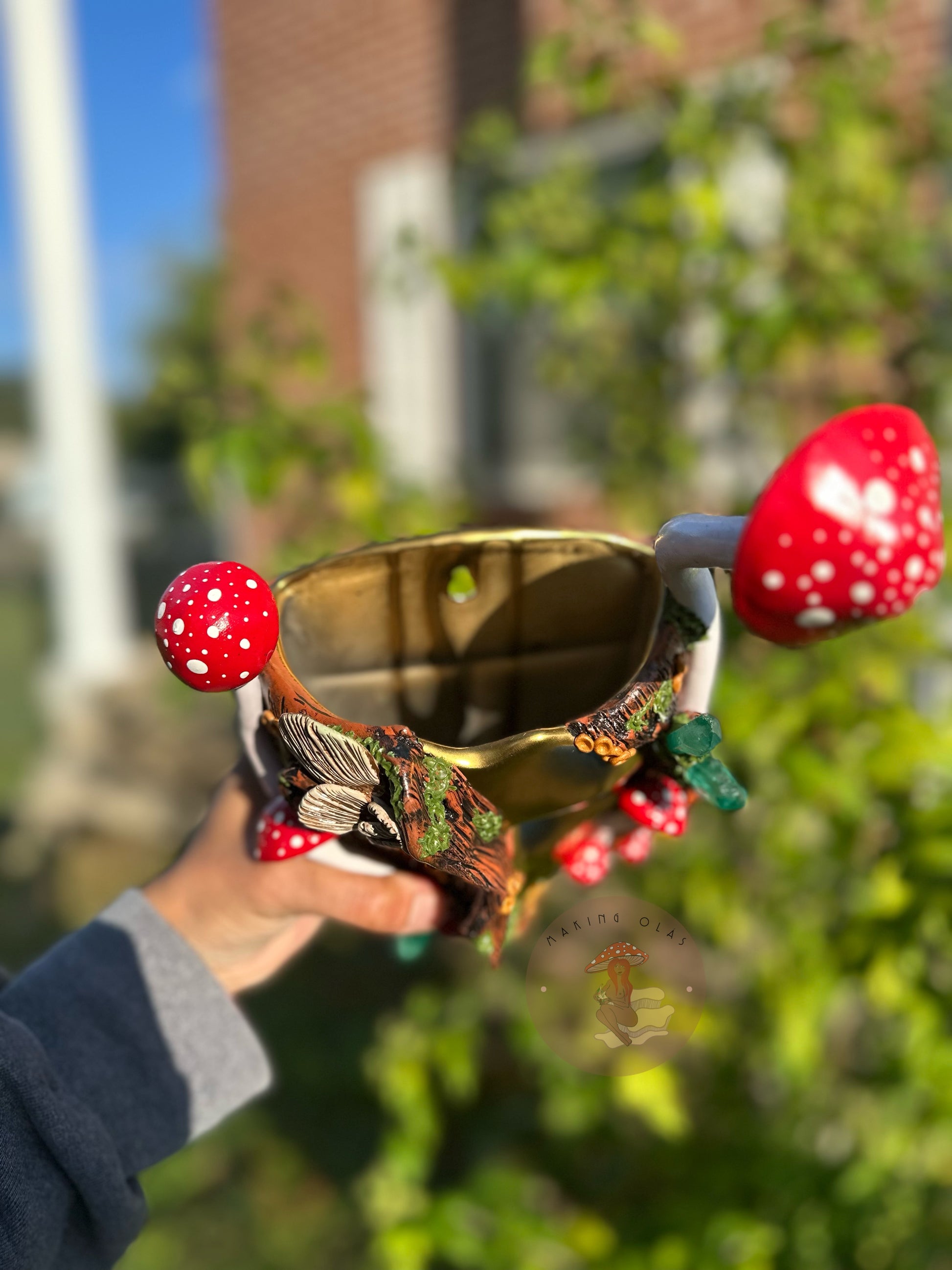 Hanging Wall Planter | Golden face Red Mushrooms Goddess with Quartz