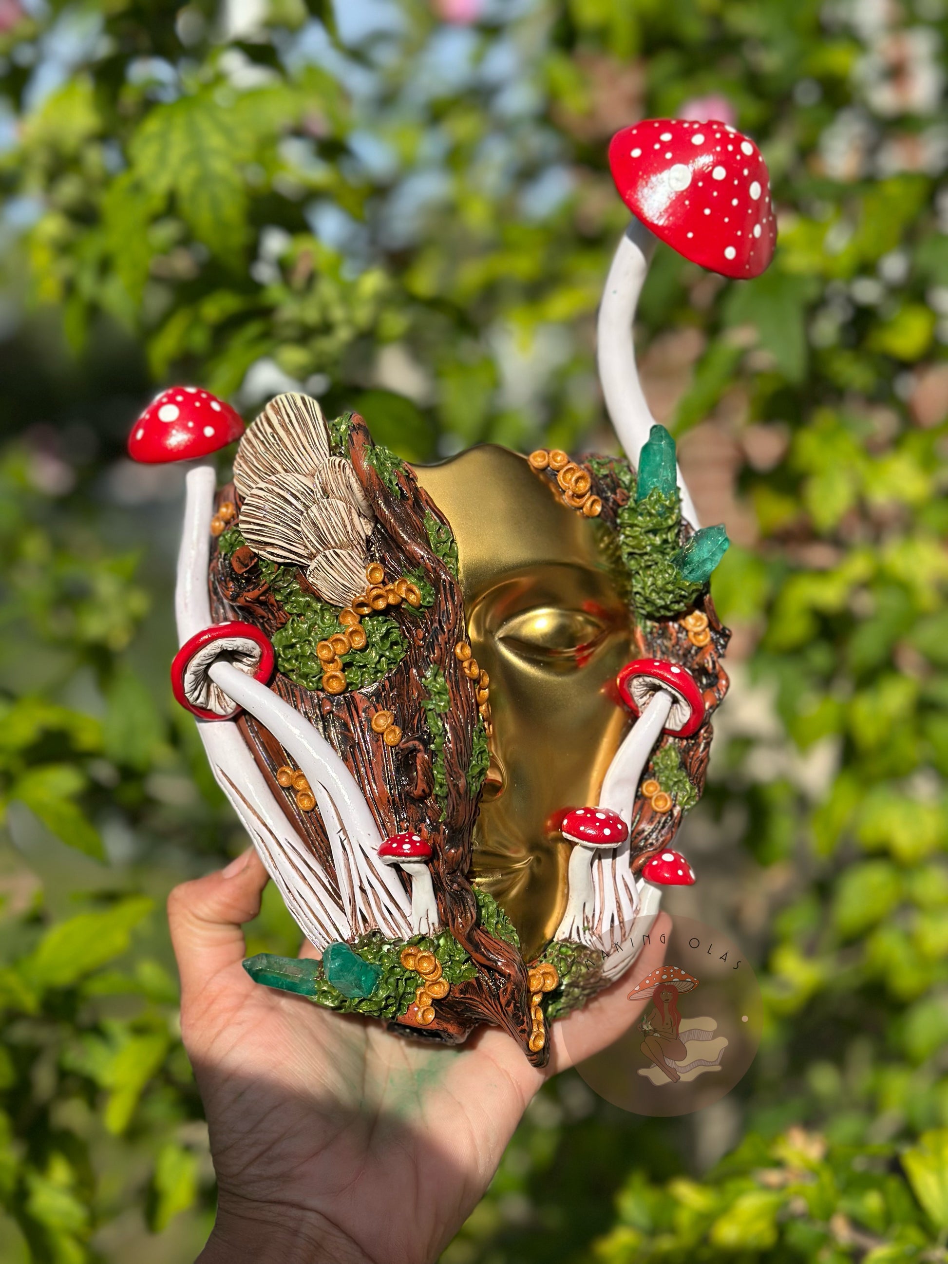 Each one is made to order with care and dedication. The actual goddess face is 5.5’ tall and the tallest mushroom extends about 3 inches taller. It is the perfect addition to any room.